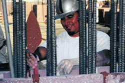 Bricklayers build walls, chimneys and other structures from masonry units such as brick, block, glass block or stone. They also line industrial kilns and furnaces, and may work in sewers. Generally, the Bricklayer’s technique is to spread the bottom and side of each unit with mortar and position it by hand, cutting off excess mortar and later trimming it to achieve a neat appearance. Work is kept level by use of a tightly stretched line and must be checked frequently for level and plumb. Some units must be cut to fit. Bricklayers often work from scaffolding. The work, especially block work, is often strenuous. In a related trade, the Pointer-Cleaner-Caulker (PCC) patches weathered masonry, replaces old mortar and does caulking, waterproofing and cleaning of both new and old masonry. They often work on swing scaffold twenty (20) stories or more up.